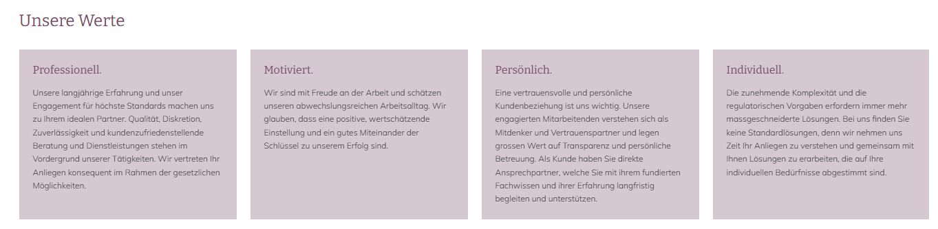 Wir sind eine unabhängige, partnerschaftlich organisierte Treuhandgesellschaft. Unsere Kernkompetenzen umfassen
