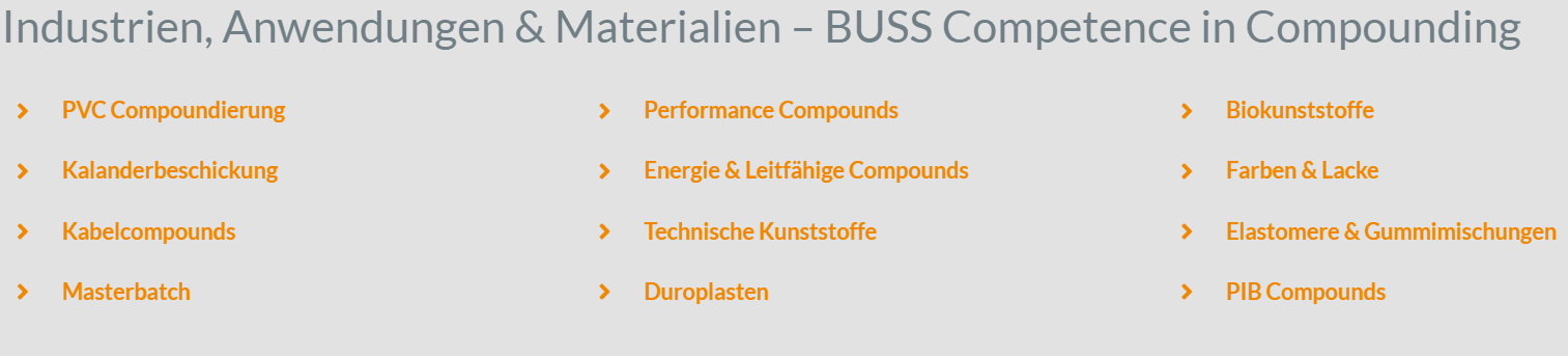 Die Kernkompetenzen von BUSS liegen in maßgeschneiderten produktspezifischen Compoundier-Lösungen, insbesondere in Verbindung mit äußerst anspruchsvollen Anforderungen an die Prozesstechnologie und Produktqualität. Diese Kompetenzen gründen sich auf über 60 Jahre Compoundier-Erfahrung in der Entwicklung und Produktion von BUSS Ko-Knetern unter kontinuierlicher Erfüllung der stetig steigenden technologischen Bedürfnisse des Marktes.