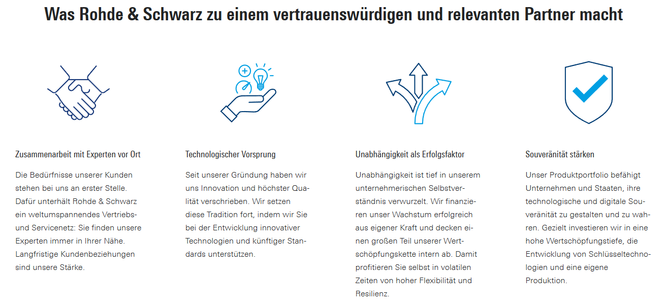 Rohde & Schwarz entwickelt, fertigt und vertreibt eine breite Palette an elektronischen Investitionsgütern für Industrie, Infrastrukturbetreiber und hoheitliche Kunden. Der unabhängige Konzern gehört in all seinen Arbeitsgebieten zu den Technologie- oder Marktführern, so in der Mobilfunk- und Hochfrequenz-Messtechnik, der Broadcast- und Medientechnik, der Flugsicherungs- und militärischen Funkkommunikation wie auch auf dem Gebiet der Cybersicherheit und Netzwerktechnik.