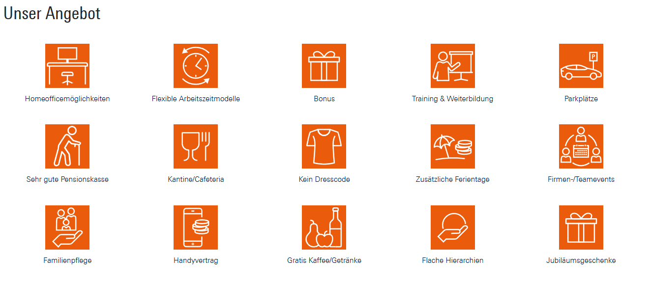 Neugierig? In der folgenden Übersicht findest du einen ersten Einblick in unsere Benefits. Bitte beachte, dass das Angebot je nach Standort variieren kann. Oder erkunde direkt unser Jobboard nach einer für dich passenden Stelle! Bei Interesse an den Sozialleistungen eines ganz konkreten Standorts kontaktiere gerne auch deinen jeweiligen Recruiting-Ansprechpartner oder -Ansprechpartnerin vor Ort.