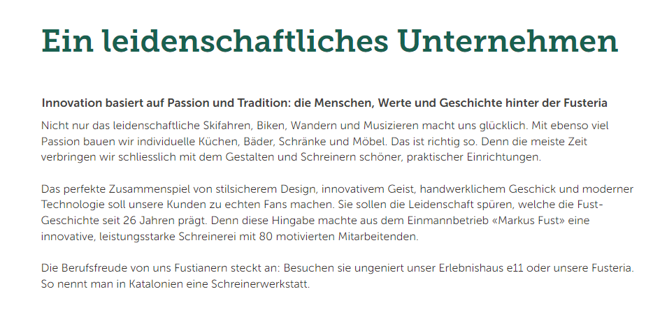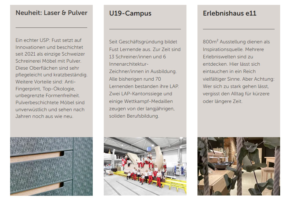 Seit 1997 kultiviert Fust in Wil das Schreinerhandwerk. Rund 75 passionierte Schreiner, Planerinnen und Lernende schaffen nachhaltige Werte für jedes Zuhause. Mit Ecoleo ist Fust führender Schweizer Online-Schreiner und mit Woodcoat Pionier im Pulverbeschichten von Holz.