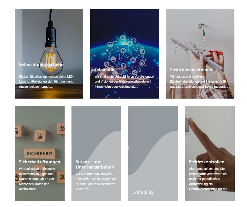- Wir bieten massgeschneiderte, projektorientierte Elektro-Lösungen für Unternehmen und Privatpersonen. Dabei unterstützen wir Sie von der Planung über die Installation bis hin zum Unterhalt.