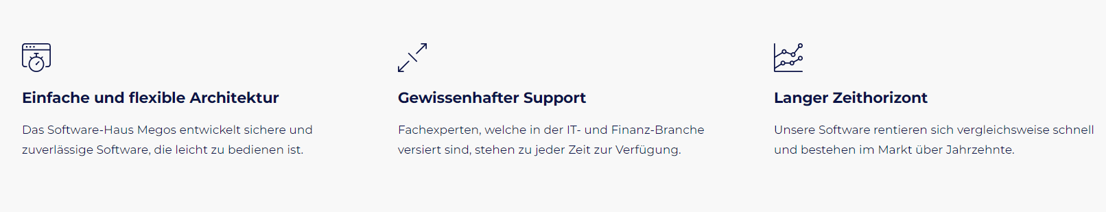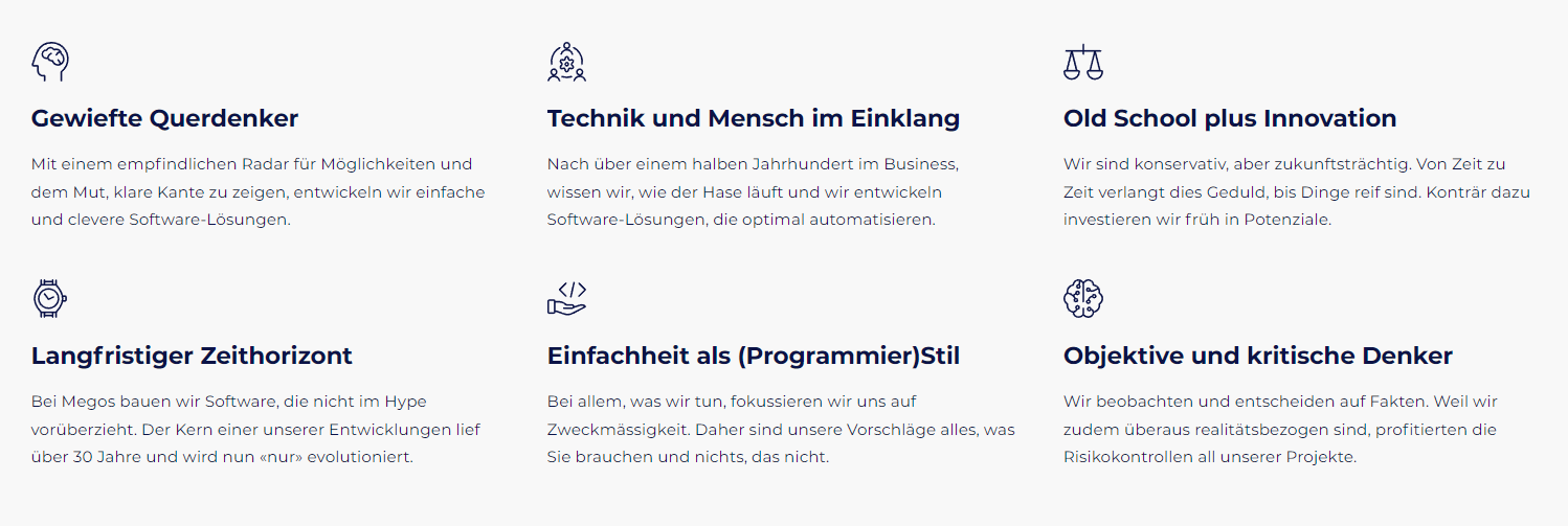 Die Megos AG ist das älteste unabhängige Software-Haus der Schweiz. Wir entwicklen leistungsfähige Standard- und Individualsoftware für die Bereiche Wertschriftenbuchhaltung, Finanzbuchhaltung und Fondsbewertung wie auch Compliance, Riskmanagement und Controlling. Mit einem langen Zeithorizont und der Courage unübliche Entscheidungen zu treffen, bauen wir Software, deren Kern über Jahrzehnte funktioniert.