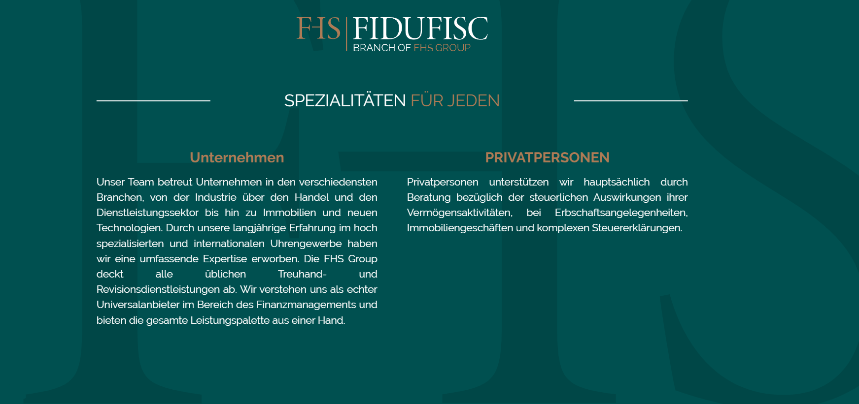 Die Fiduciaire Horlogère Suisse wurde 1928 von Uhrmachern und Bankiers gegründet und bietet qualitativ hochwertige Dienstleistungen in den Bereichen Buchhaltung, Steuern, Revision und Beratung für Unternehmer und Unternehmen.