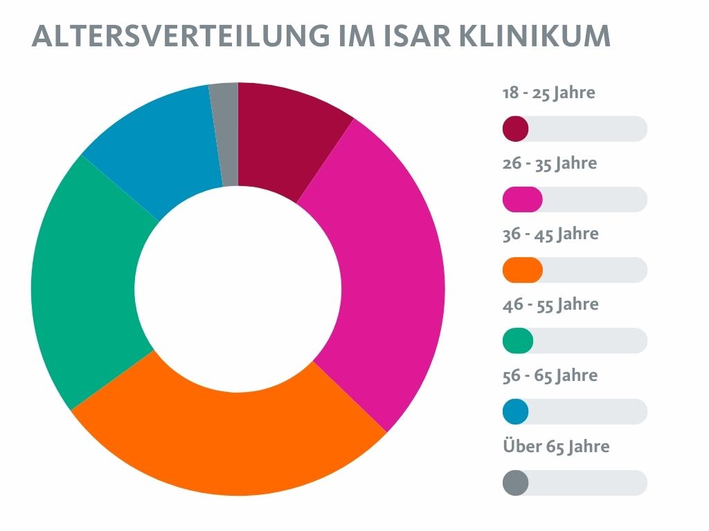 Hinsichtlich der Altersverteilung unserer Mitarbeiter:innen umfasst unsere Klinik nahezu alle Altersklassen – denn wir wissen, dass durch die Zusammenarbeit unterschiedlicher Generationen viel voneinander gelernt wird und so am Ende alle profitieren. Darüber hinaus sind in unserem Haus 64 verschiedene Ethnien vertreten, wodurch wir ein multikulturelles und weltoffenes Arbeitsumfeld haben.