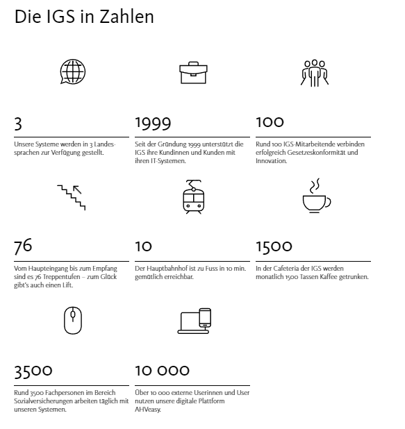 Der IGS sind heute 20 Sozialversicherungsunternehmen aus allen drei Sprachregionen der Schweiz sowie die Liechtensteinische AHV-IV-FAK angeschlossen. Unsere Services und unser Portfolio bieten ihnen ein umfassendes Angebot rund um die benötigten Informationssysteme. Für unsere Community produzieren wir massgeschneiderte digitale Lösungen mit dem Ziel, ihre Prozesse optimal zu unterstützen.