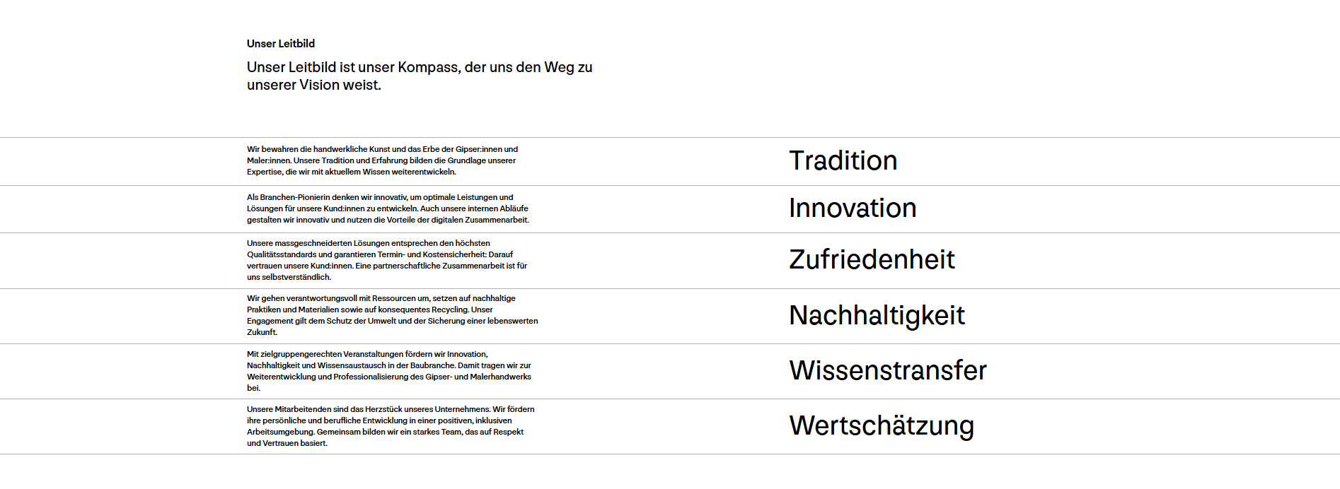 «Wir bewahren die Tradition sowie das Handwerk und setzen als Marktführerin innovative Massstäbe in der Branche. Qualität, Zuverlässigkeit und Nachhaltigkeit sind die Schlüssel unseres überregionalen Erfolgs, mit diesen gestalten wir eine positive Zukunft für nachfolgende Generationen.»