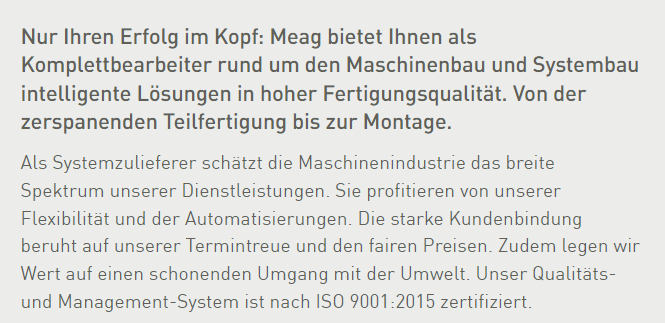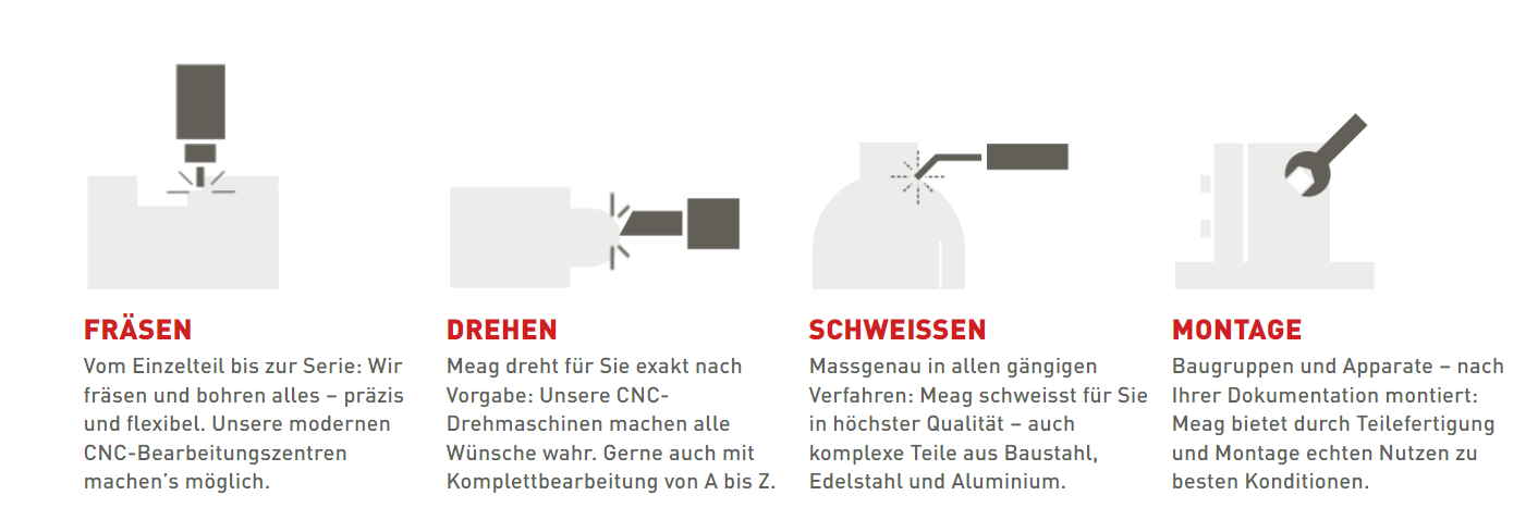Meag ist ein unabhängiges Schweizer Unternehmen mit Sitz in Gretzenbach, Kanton Solothurn. Über 100 qualifizierte Mitarbeitende erbringen Dienstleistungen für die Maschinenindustrie. Stärken sind die zerspanende und die mit der Konstruktionsschlosserei kombinierte Teilefertigung. Als Komplettanbieter erfüllt Meag alle Ihre Bedürfnisse aus einer Hand. Vom Materialeinkauf über die Herstellung und Veredelung bis zur Logistiklösung. Als Generalunternehmer leistet Ihnen Meag zudem wertvolle Dienste in der Fertigungsberatung.