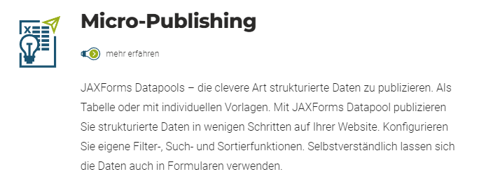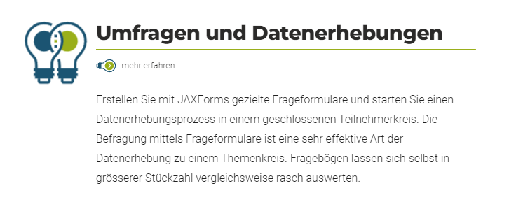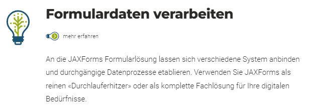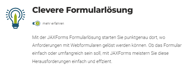 JAXForms unterstützt Ihre digitale Transformation mit einer NoCode-Plattform als Saas- oder OnPrem-Lösung: Vom einfachen Formular bis hin zur komplexen Fachlösung. In wenigen Tagen präsentieren wir Ihnen einen funktionalen Prototypen und zeigen Ihnen, wie Sie ihre analogen Prozesse optimal medienbruchfrei digitalisieren können.