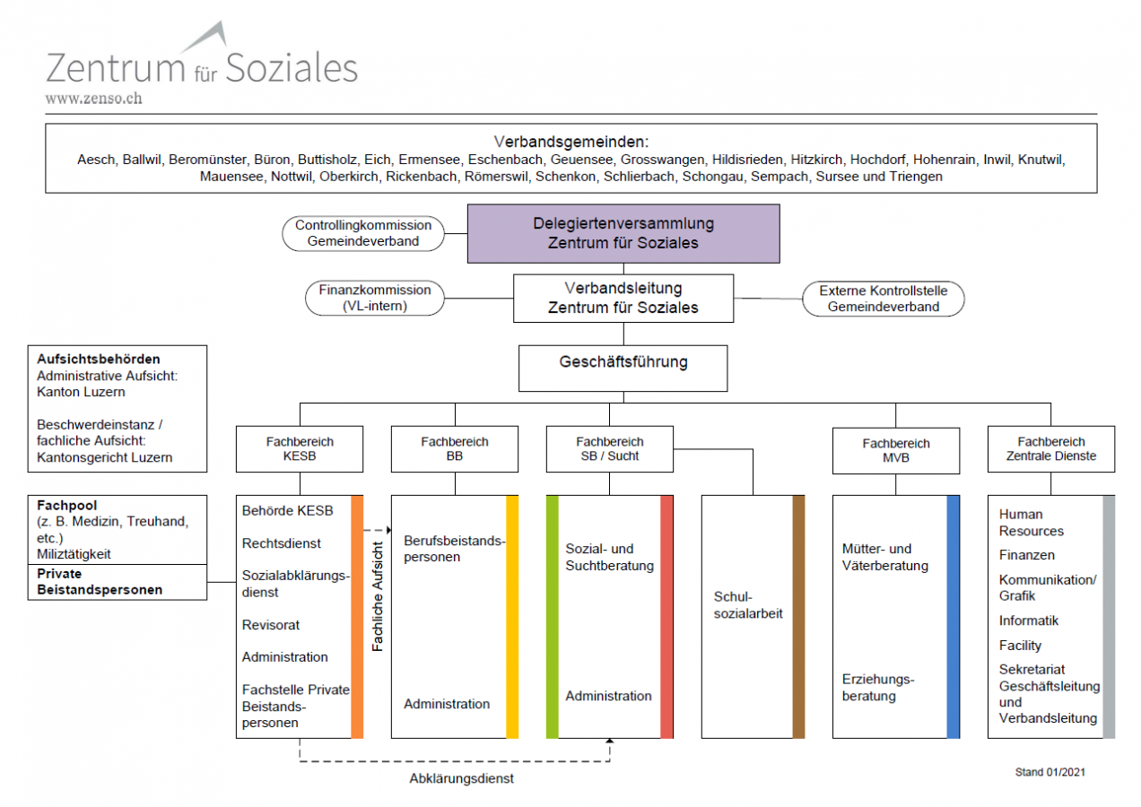 Das Zentrum für Soziales führt im Auftrag der Mitgliedergemeinden die KESB, die Berufsbeistandschaft, die Sozialberatung, die Mütter- und Väterberatung, die Suchtberatung und die Schulsozialarbeit. Die 28 Gemeinden mit einer Bevölkerung von rund 93‘000 Personen organisieren sich in Form eines Gemeindeverbandes, um in enger und wirtschaftlich sinnvoller Zusammenarbeit die Herausforderungen der Zukunft gemeinsam, niederschwellig und regional vernetzt zu lösen.