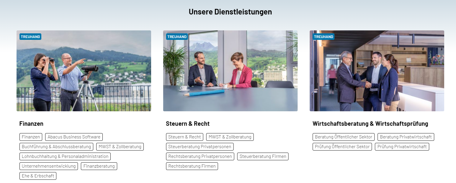 Unser Treuhand-Dienstleistungsangebot orientiert sich an den Bedürfnissen unserer Kunden. Als Ansprechpartner für nachhaltige Lösungen pflegen wir langfristige Beziehungen mit unseren Auftraggebern. Dabei ist uns das gegenseitige Vertrauen besonders wichtig. Wir sind stolz aktuell über 3'000 Mandate von Unternehmen aus den verschiedensten Branchen, Privatpersonen, öffentlich-rechtlichen Körperschaften, Genossenschaften, Verbänden und Stiftungen betreuen zu dürfen. Ausserdem beraten wir auch Institutionen, Unternehmen und Personen im Gesundheitswesen, z.B. Gesundheitswesen wie z.B. Allgemeinmediziner, Zahnärztinnen und Fachspezialisten