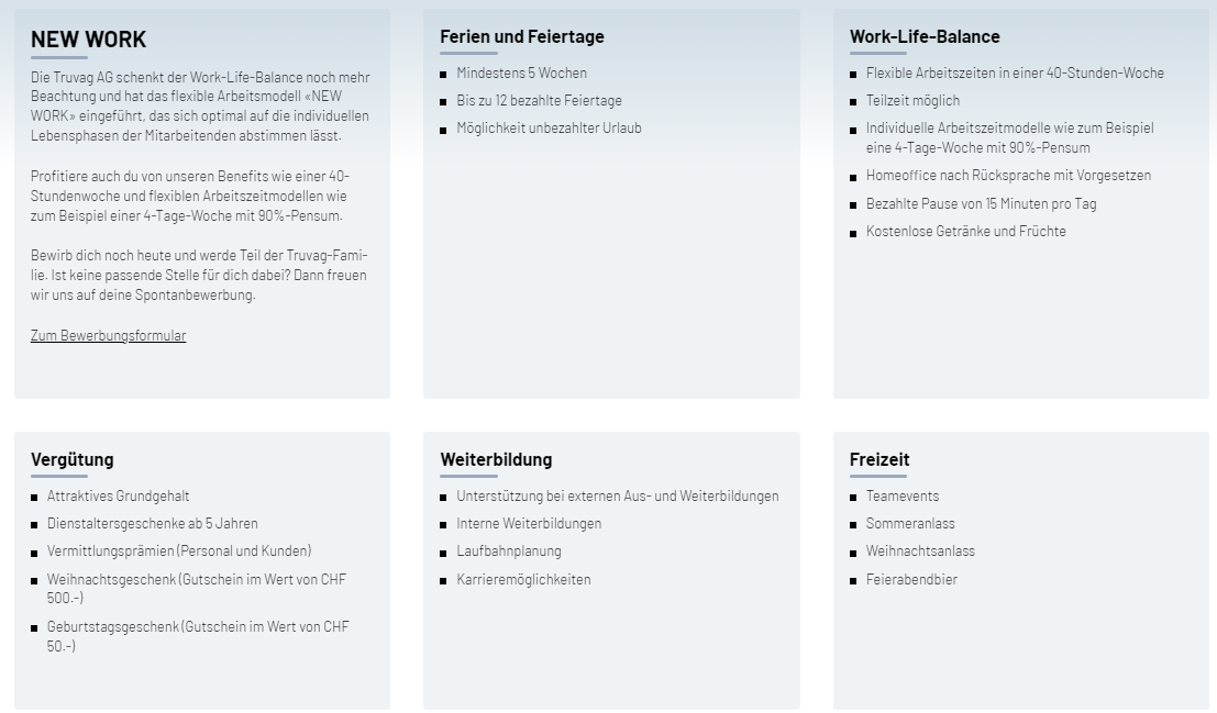«Die Truvag AG legt grossen Wert auf eine positive und motivierende Unternehmenskultur. Der Teamzusammenhalt ist stark und wir arbeiten produktiv und effizient zusammen. Es gibt regelmässig Teamaktivitäten und eine offene Kommunikation, die es sehr angenehm macht hier zu arbeiten.»