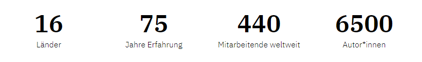 In insgesamt 16 Ländern sind bei uns mehr als 440 Menschen damit beschäftigt, Fachleuten Informationen zu bieten, die sie für eine langfristig erfolgreiche Arbeit benötigen. Die Diversität und kulturelle Vielfalt unserer Kolleg*innen bereichert und inspiriert uns jeden Tag aufs Neue und versetzt uns in die Lage, auf die national leicht unterschiedlichen Bedürfnisse unserer Kund*innen optimal eingehen zu können.