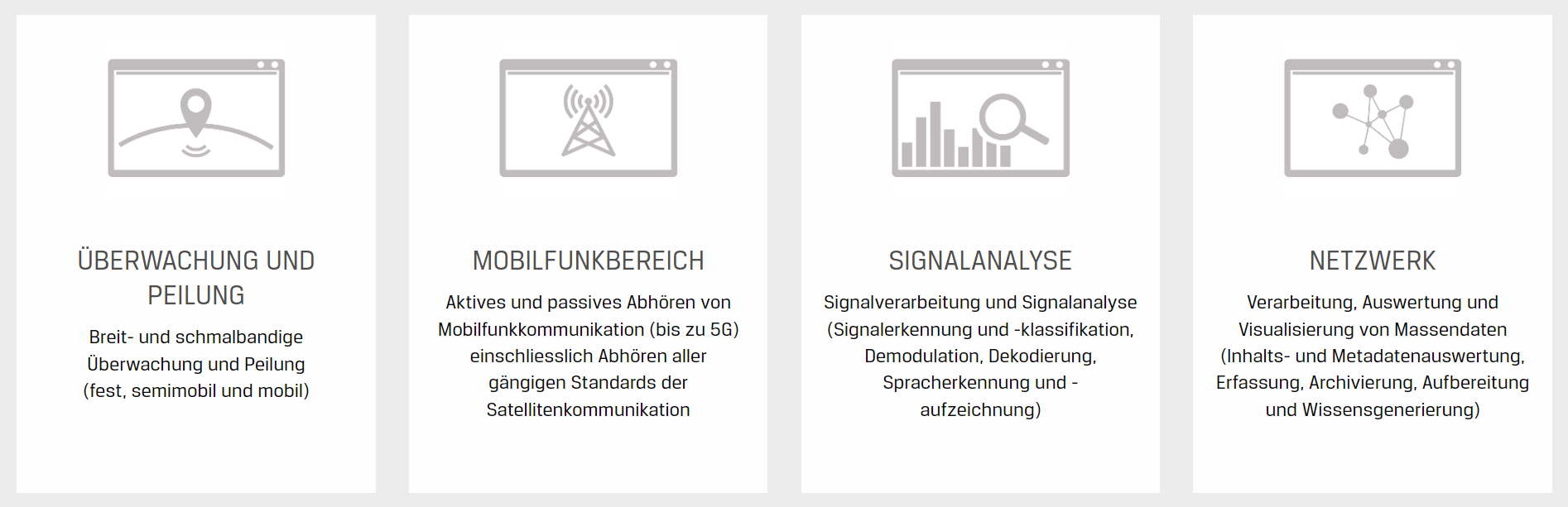 - Breitband- und Schmalbandüberwachung sowie Funkpeilung (stationär, semi-mobil und mobil)