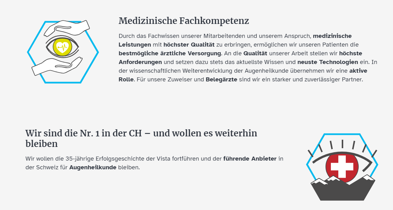 Die Vista Gruppe zählt mit ihren zahlreichen Standorten zu den führenden privaten Augenkliniken in der Schweiz mit rund 400 Mitarbeitenden. Wir bieten erstklassige medizinische Leistungen in allen Bereichen der Augenheilkunde, der Augenchirurgie sowie der Augenlasermedizin an.
