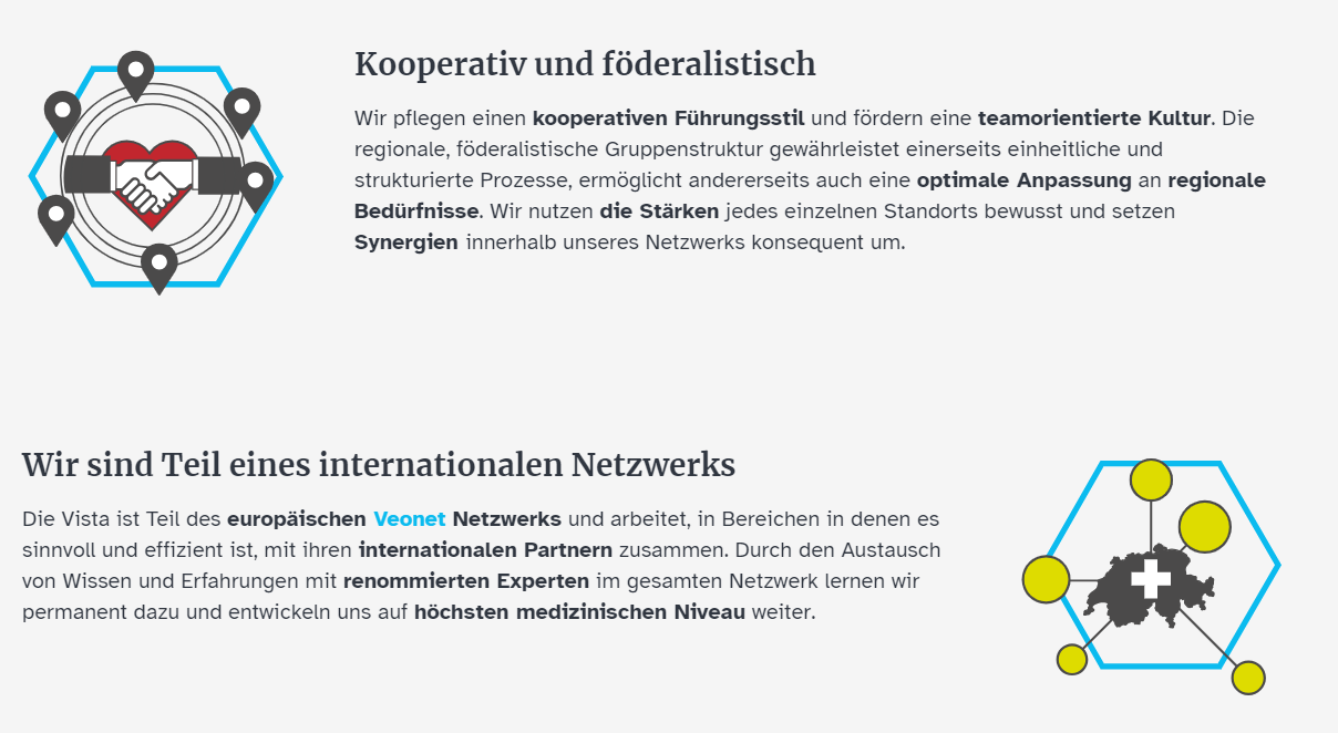 Unsere Mitarbeitenden sind ein entscheidender Erfolgsfaktor. Sie sorgen Tag für Tag für eine optimale Betreuung und Behandlung unserer Patienten und prägen die Vista Gruppe entscheidend. Uns ist es ausserordentlich wichtig, dass sich unsere Mitarbeitenden – beruflich – zu Hause fühlen und sie optimal gefördert werden. Neben sehr guten Arbeitsbedingungen legt die Vista grossen Wert auf eine optimale Fort- und Weiterbildung ihrer Mitarbeitenden – in allen Bereichen.
