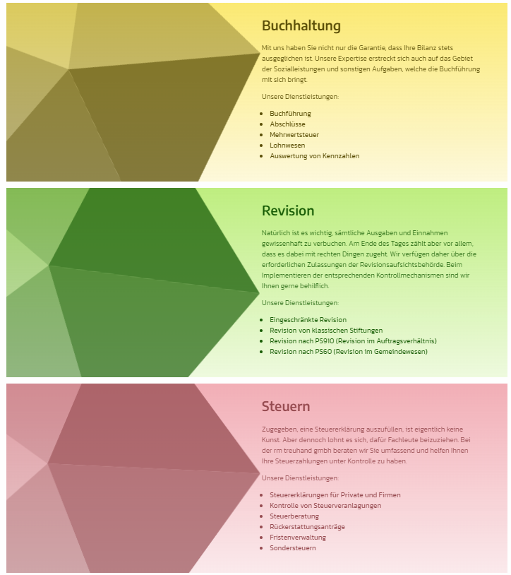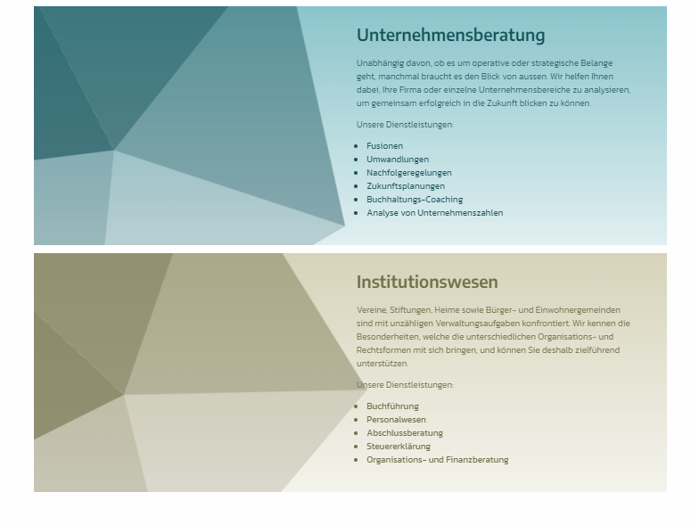 Ob Sie sich als Privatperson oder im geschäftlichen Kontext an uns wenden, spielt eigentlich keine Rolle. Seit 2001 kümmern wir uns mit viel Engagement und Diskretion um Ihre finanziellen Anliegen. Zudem unterstützen wir Sie in der Unternehmensberatung und im Institutionswesen (Stiftungen, Vereine, usw.). Dabei übernehmen wir sämtliche Steuer-, Finanz- und Revisionsangelegenheiten.