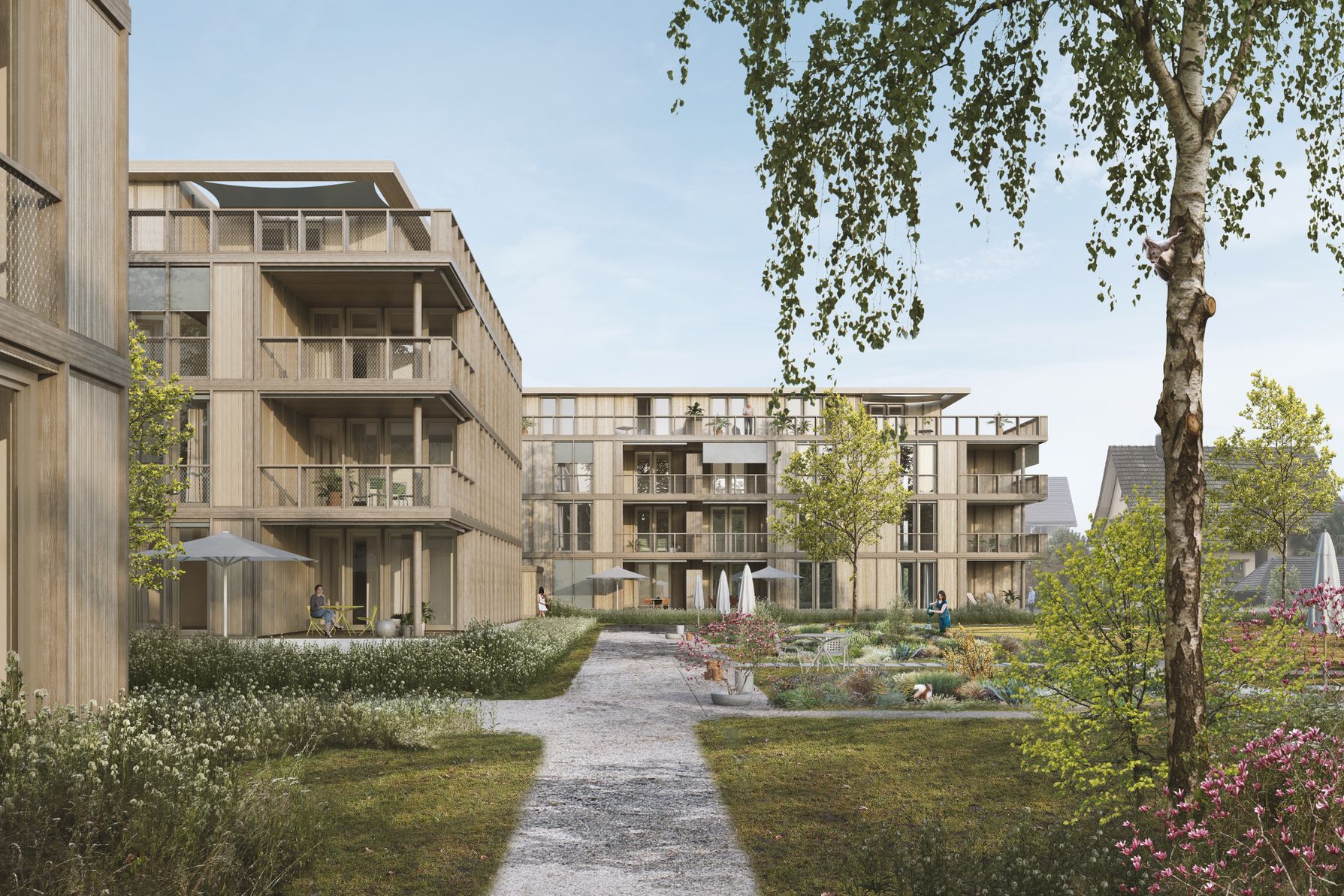 Für den kleinen Ort Suhr und die Wettbewerbsparzelle im Speziellen, ist der Bezug zur Natur sehr wichtig. Naherholungsorte im unmittelbaren Grün, kreieren grosse Wohn- und Lebensqualität. Mit der alten Gärtnerei erfuhren die umliegenden Wohnbauten bislang eine zusätzliche Dimension des Grünen. Zusammen mit der angehobenen Waldlichtung im Westen des Wettbewerbsperimeters lebten die Anwohner sowohl mit wildem Waldgefühl, als auch in mitten gezüchteter Blumenschönheit. In unserem Projekt lebt der Geist der alten Gärtnerei weiter. Dort wo heute ein Grossteil der Treibhäuser steht, soll eine gemeinsame Gartenanlage entstehen, welche als neuer Begegnungsort für die Bewohner der zukünftigen Überbauung dienen soll.