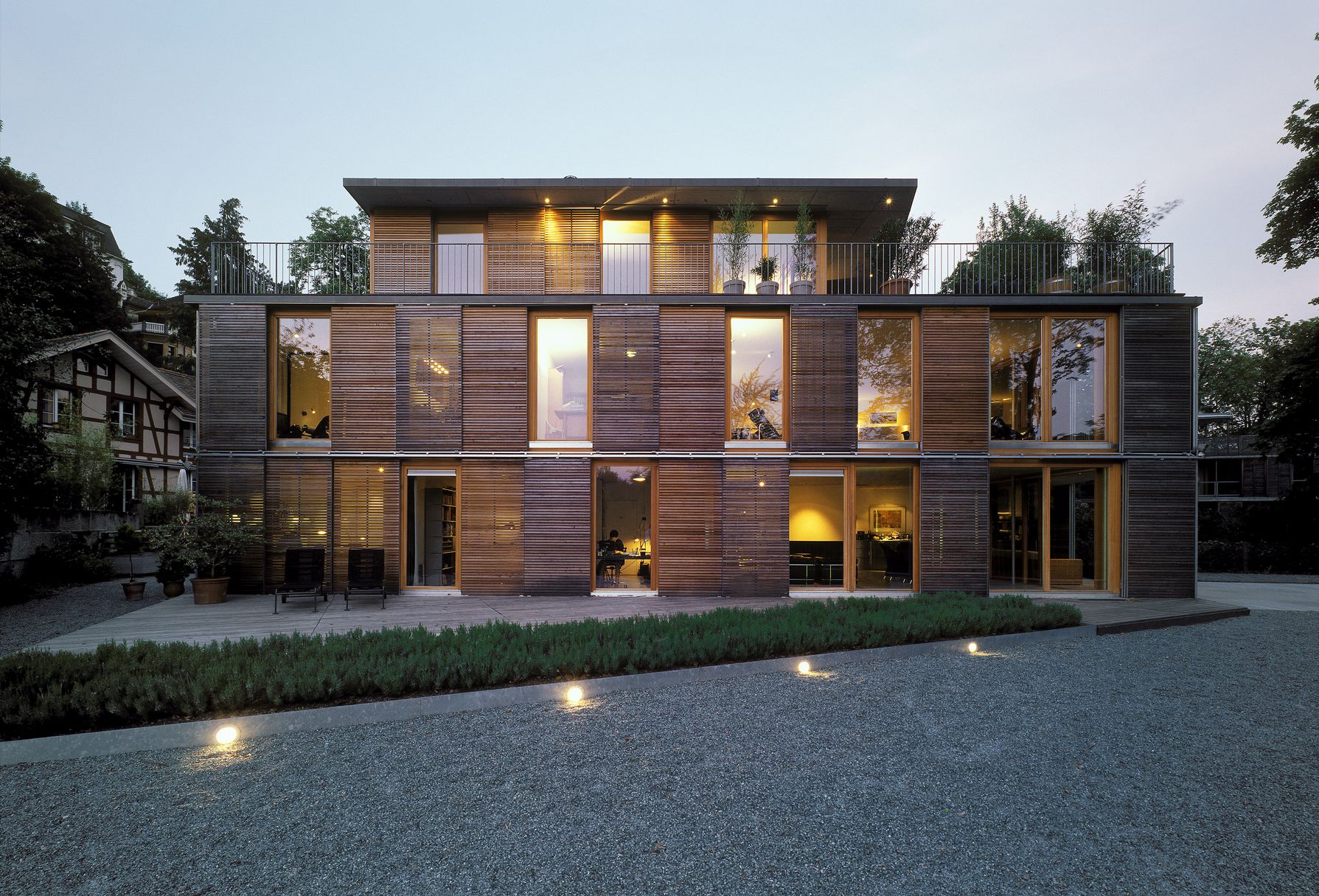 Ein Haus fast wie eine Gartenlaube so luftig und mühelos fliesst der Aussen- in den Innenraum, scheinen sich Natur und Architektur zu durchdringen, dass man das Gebäude einem Traum von südlicher Unbeschwertheit entsprungen glaubt. Vier Häuser dieser Art sind es, die 2003 am rechtsufrigen Nordhang der Aare, mitten in Bern, unterhalb des Kursaals und nahe der Kornhausbrücke, vom Architekten Daniel Spreng in die Parklandschaft eines alten historistischen Villenensembles aus dem 19. Jahrhundert hineingebaut wurden. Tatsächlich sorgte die radikale Modernität der zweigeschossigen Häuser mit Atelieraufbauten an diesem von behaglich-grossbürgerlicher Tradition geprägten Ort erst für einigen Widerstand — doch inzwischen ist die Architektur mit ihrer pavillonartigen Leichtigkeit hier im Altenbergquartier selbst zum modernen Klassiker geworden.