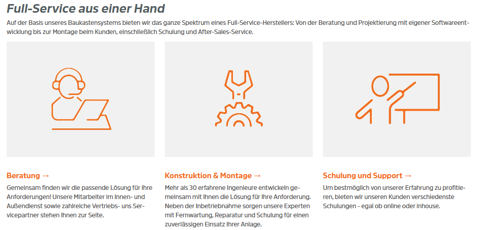 Auf Basis unseres Profilsystems realisieren unsere Ingenieure für Sie einsatzfertige Lösungen zu jeder Aufgabenstellung im Anlagen- und Sondermaschinenbau. Das reicht vom Montagearbeitsplatz über Förderanlagen und Schutzsysteme bis zu hochautomatisierten Komplettlösungen. Als Full-Service-Anbieter sind wir dabei Ihr verlässlicher Partner von der Prozessanalyse über die Inbetriebnahme vor Ort bis hin zu Schulung und Support.