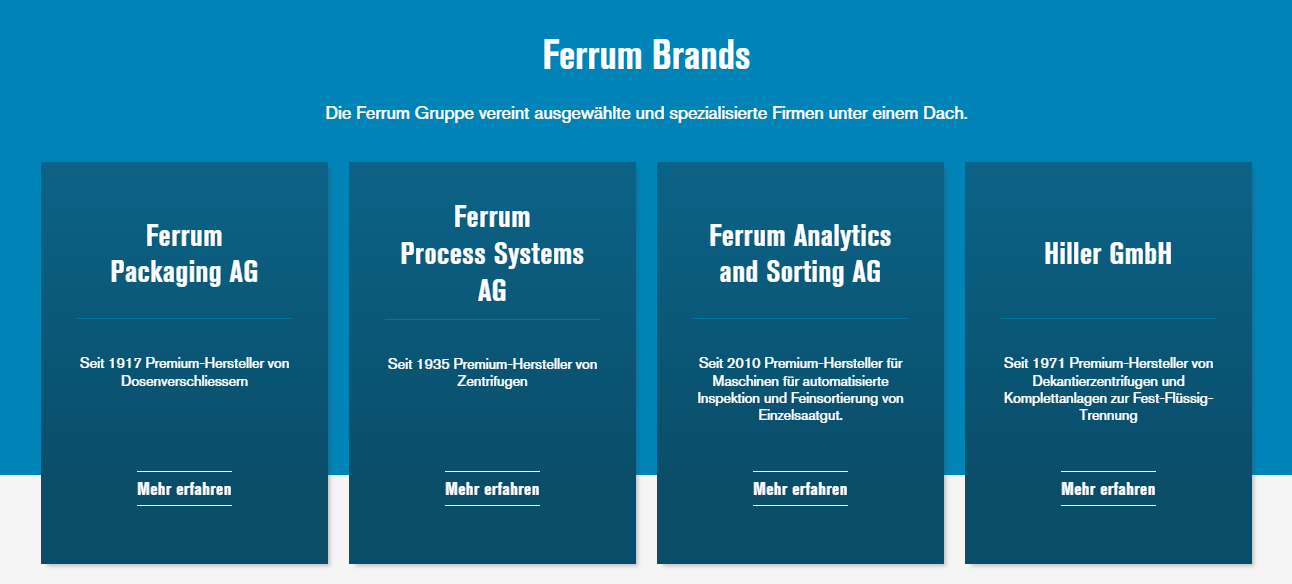 Die Ferrum Gruppe unter dem Namen Ferrum AG vereint die beiden Tochterfirmen Ferrum Packaging AG und Ferrum Process Systems AG und steht für innovative Produkte und Dienstleistungen auf höchstem Qualitätsniveau. Die Ferrum Gruppe hat Ihren Hauptsitz in der Schweiz und Partnerfirmen sowie Vertretungen auf der ganzen Welt. Das Angebot der Ferrum Gruppe ist breit diversifiziert und fliesst in zahlreiche Wirtschaftsbranchen. Die weltweite Tätigkeit auf allen Kontinenten, der hohe Eigenfinanzierungsgrad sowie die wirtschaftliche Unabhängigkeit sichern dem Konzern eine starke Stellung mit ausgezeichneten Zukunftsperspektiven.