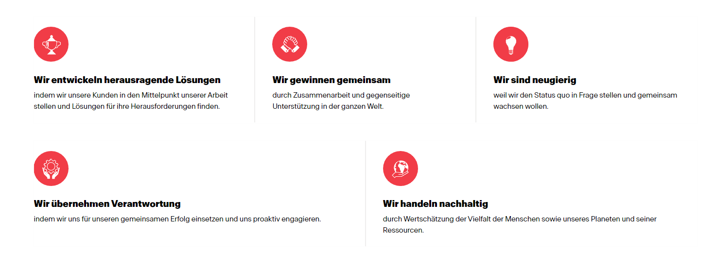 Dabei sind es unsere fünf Werte, die es uns ermöglichen, ein Arbeitsumfeld zu gestalten, das begeistert. Sie sind unsere Grundfeste in Zeiten des Wandels und die Leitplanken unseres täglichen Handelns gegenüber unseren Kunden, Partnern, Mitarbeitenden und unserer Umwelt: