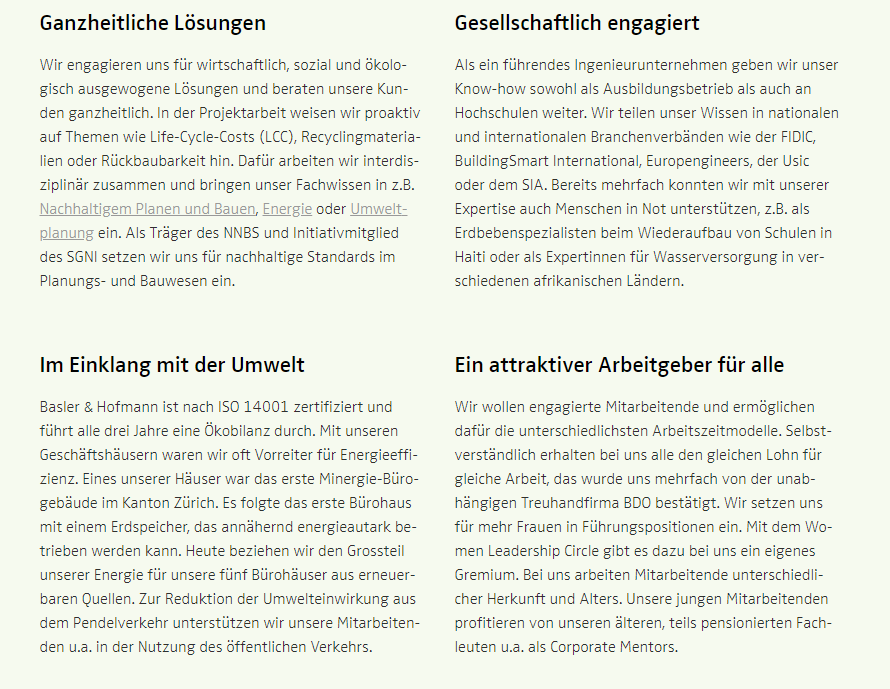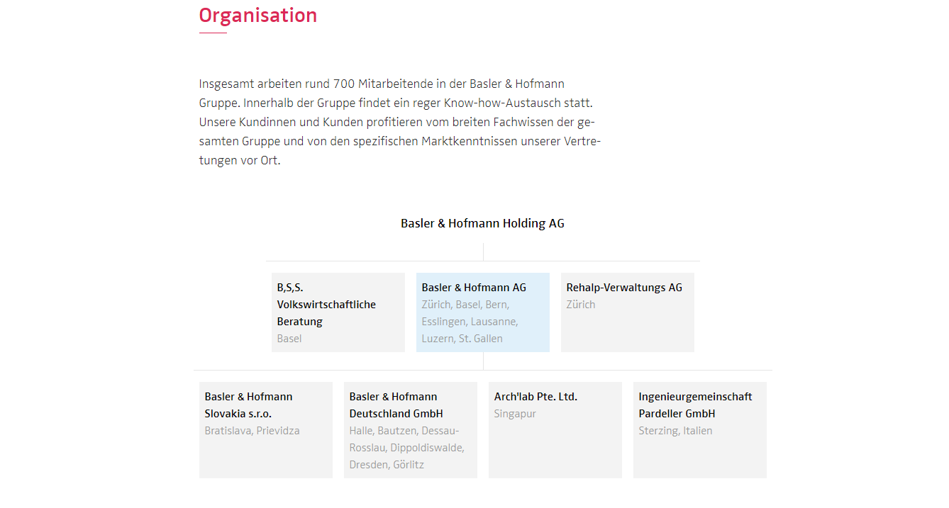 Basler & Hofmann ist ein unabhängiges Ingenieur-, Planungs- und Beratungsunternehmen. Wir entwickeln wegweisende Lösungen für unseren intensiv genutzten Raum. Fachleute aus über 30 Disziplinen arbeiten dafür zusammen. Vernetztes Denken und der Blick fürs Ganze zeichnen unsere Arbeit aus.