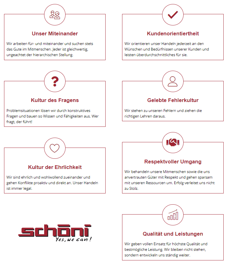 Mit Schöni fährt der Kunde besser! Die Unternehmenskultur erlaubt den anstehenden Erfolg von Schöni. Darunter sind: